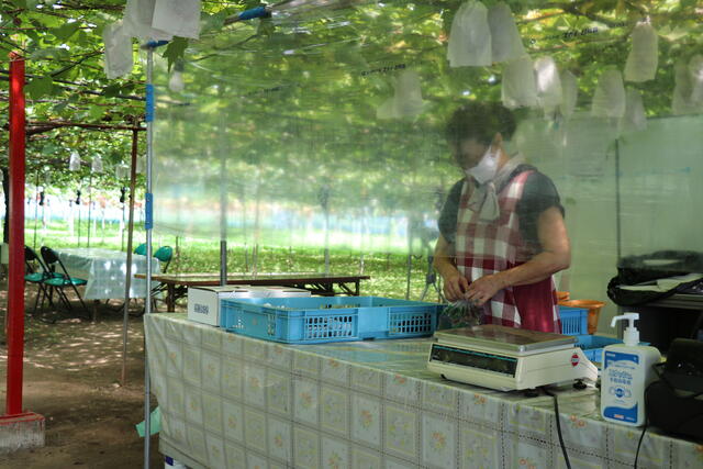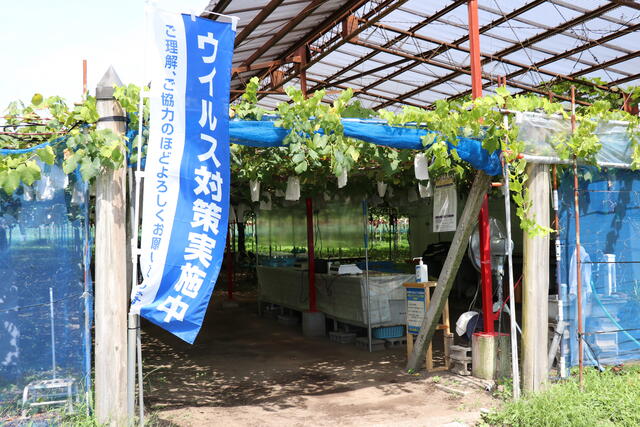 ※吉岡町小倉ぶどう郷では、受付への消毒液設置や園内テーブル等の配置配慮、こまめな消毒作業等の感染症対策を実施しています。
