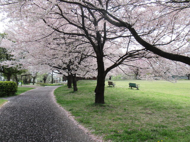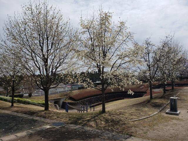園内には芝生が敷かれた広場があり、その広場より少し低い場所に散策コースがあります。